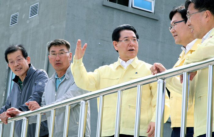 | ▲ 김영록 전남도지사, 보성 배수펌프장을 찾아 점검하고 있다.(출처=전남도) |
