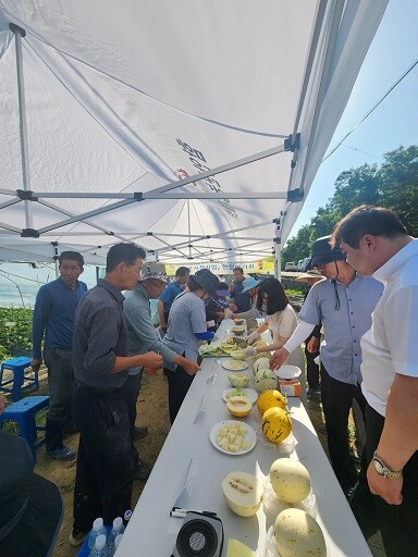 농업기술센터 안병국 소장을 비롯한 관계 공무원, 멜론재배 농업인, 멜론 유통법인, 육종업체 등 20여명이 참가한 이날 평가회에는 네트멜론과 무네트 멜론으로 나눠 신규멜론 품종 지역 적응 시험을 실시하고, 평가결과 발표와 질의 답변하는 시간을 가졌다.