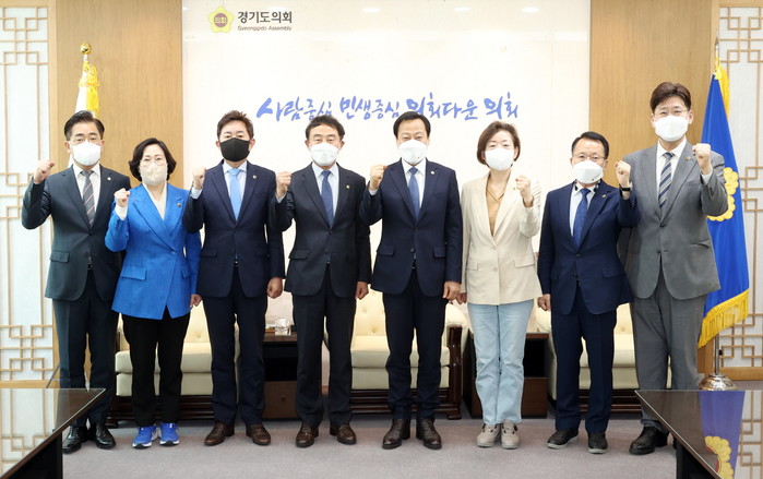 | ▲ 정담회에 참석한 경기도의회 의장단 및 교섭단체 수석대표단이 기념촬영을 하고 있다. (사진제공=경기도의회) |