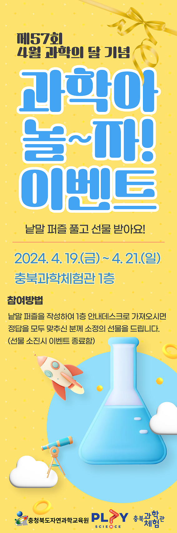 [청주=최성일 기자] 충청북도교육청 직속기관 자연과학교육원은 21일(일)까지 과학체험관에서 과학의 달을 맞이하여 낱말퍼즐 이벤트를 진행한다.