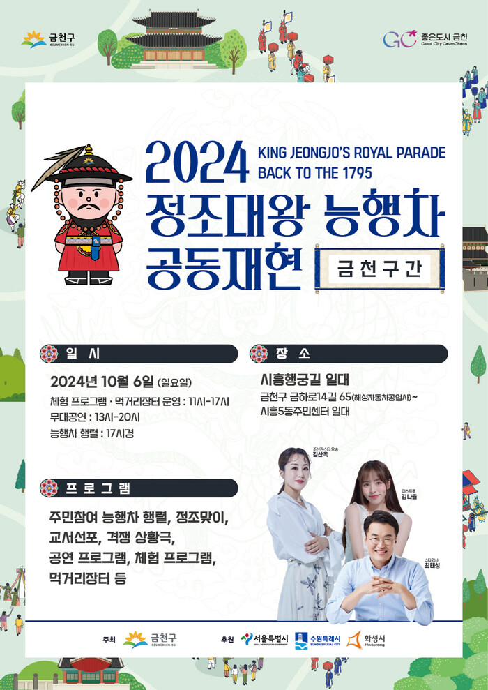 [시민일보 = 여영준 기자] 금천구(구청장 유성훈)는 오는 6일 오전 11시~오후 8시 시흥대로와 시흥행궁터 일대에서 ‘제7회 정조대왕 능행차 공동 재현행사’를 개최한다고 밝혔다.