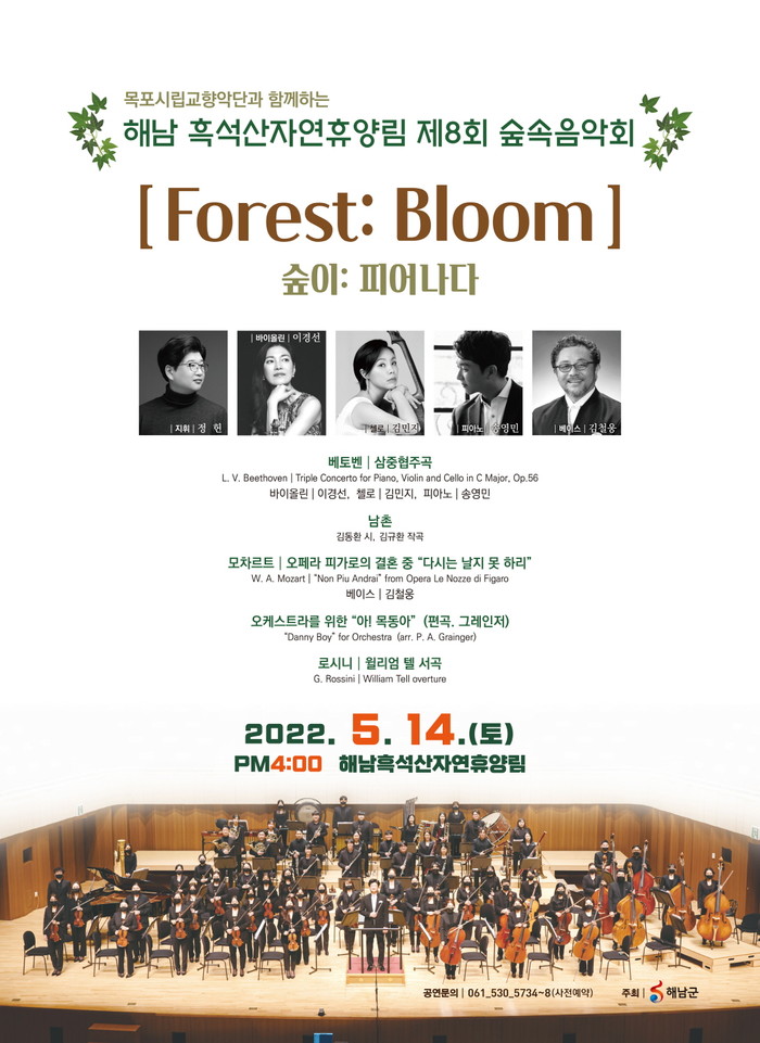 ‘Forest:Bloom 숲이 피어나다’를 주제로 한 이번 음악회에서는 목포시립교향악단의 베토벤 삼중협주곡, 로시니의 윌리엄 텔 서곡연주와 함께 이경선 바이올리니스트, 김민지 첼리스트, 송영민 피아니스트의 협연이 이뤄진다.