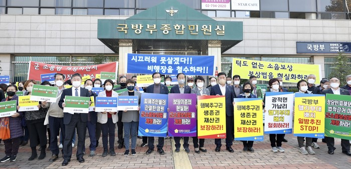 [수원=임종인 기자] 군용비행장 피해 공동대응을 위한 지방의회 전국연합회(이하 군지련)가 최근 서울 용산구 국방부 앞에서 집회를 열고 '군소음 피해보상법' 개정을 촉구했다.