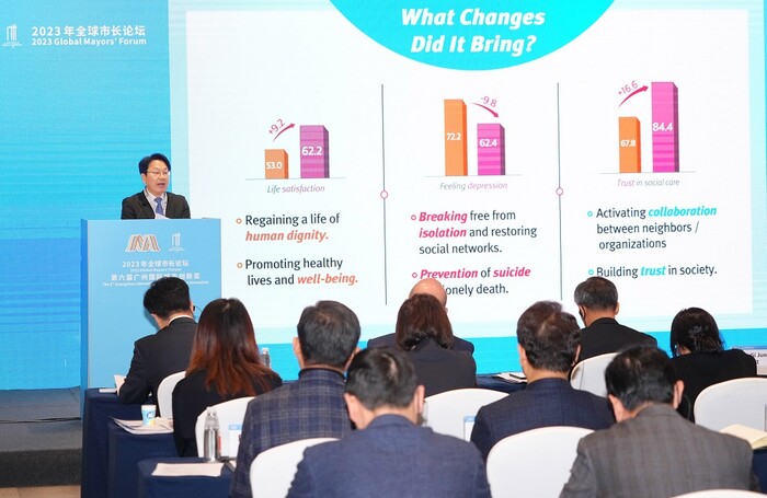 | ▲ 강기정 광주광역시장은 지난 9일 오전 중국 광저우시 월수컨벤션센터에서 열린 '제3회 세계시장포럼'에 참석해 '광주다움 통합돌봄' 정책을 발표하고 있다./광주광역시 제공 |