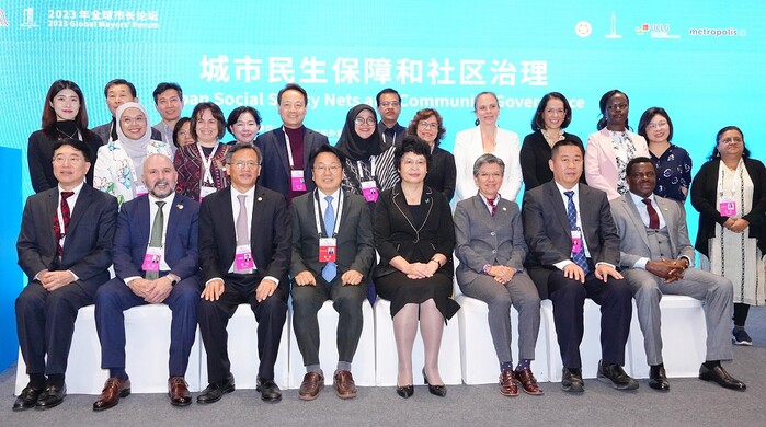 | ▲ 강기정 광주광역시장(앞줄 왼 쪽부터 네 번째)은 지난 9일 오전 중국 광저우시 월수컨벤션센터에서 열린 '제3회 세계시장포럼'에 참석해 세계 각국 도시 대표들과 기념촬영을 하고 있다./광주광역시 제공 |
