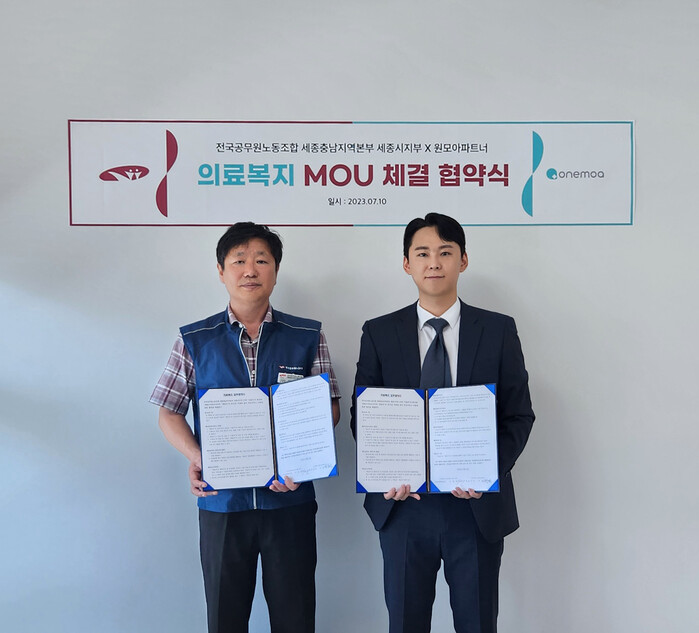 지난 10일 전국공무원노동조합 세종충남지역본부 세종시지부 회의실에서 ㈜원모아파트너 서동욱 대표와 전국공무원노동조합 세종충남지역본부 세종시지부 이재관 비상대책위원장이 의료복지 MOU를 체결하였으며, ㈜원모아파트너 오혁 대리와 전국공무원노동조합 세종충남지역본부 세종시지부 사무차장이 참여했다.