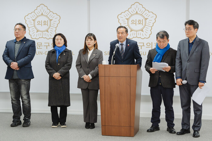 | ▲ 서대문구의회 김양희 의장(오른쪽 세 번째)이 입장문을 발표하고 있다. (사진=서대문구의회 제공) |