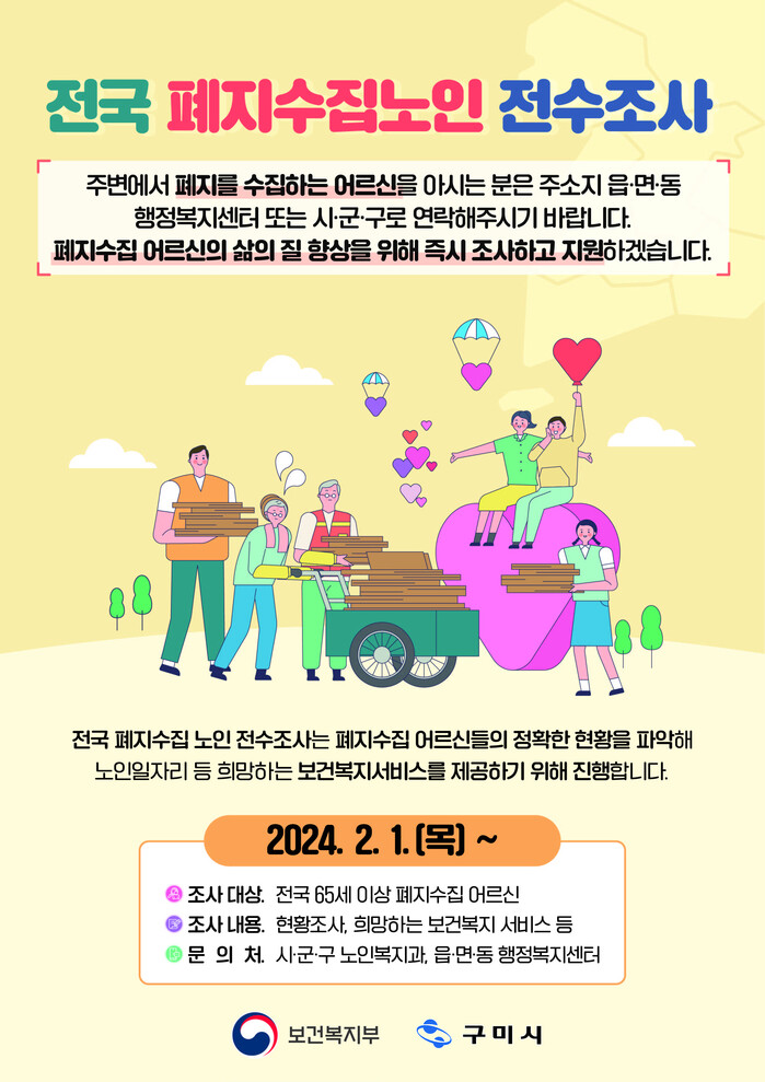 [구미=박병상 기자] 경북 구미시는 3월 말까지 65세 이상 폐지 수집 노인에 대한 전수조사를 실시한다.