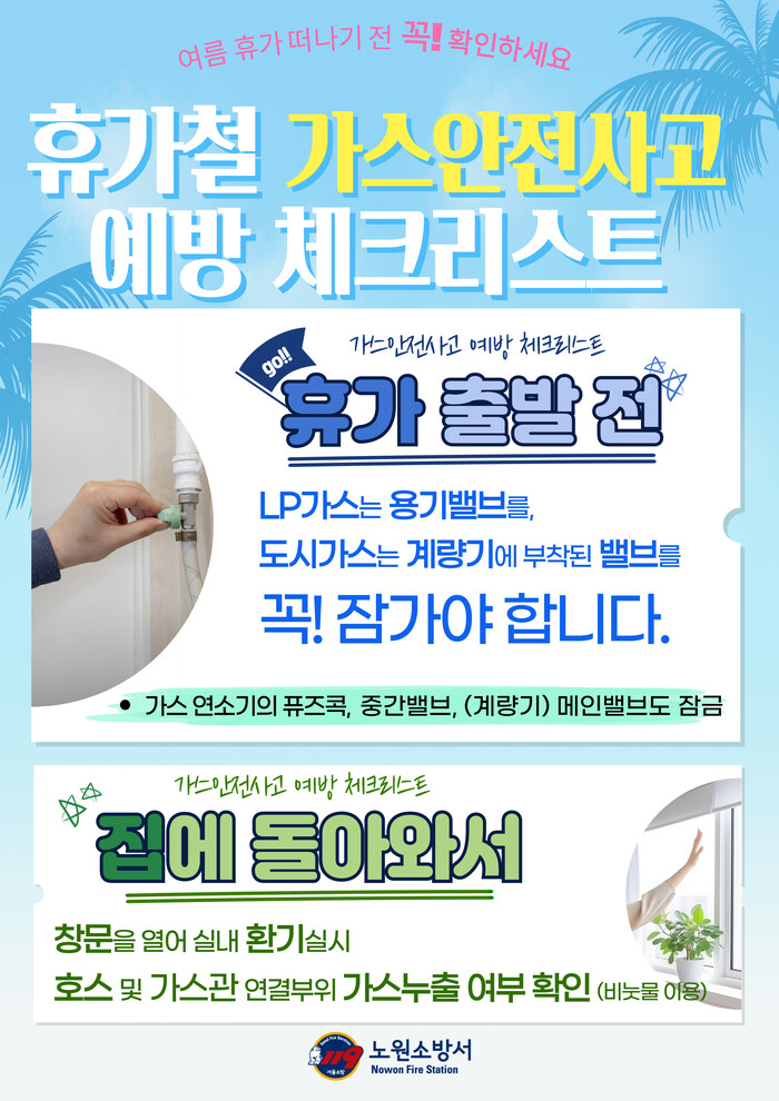 노원소방서 관계자는 “가스안전은 단순한 점검을 넘어 가족의 생명과 재산을 지키는 가장 기본적이면서도 중요한 예방조치”라며 “작은 부주의가 큰 참사로 이어질 수 있는 만큼 휴가철에는 반드시 사전 점검을 철저히 해주길 당부드린다”고 말했다.