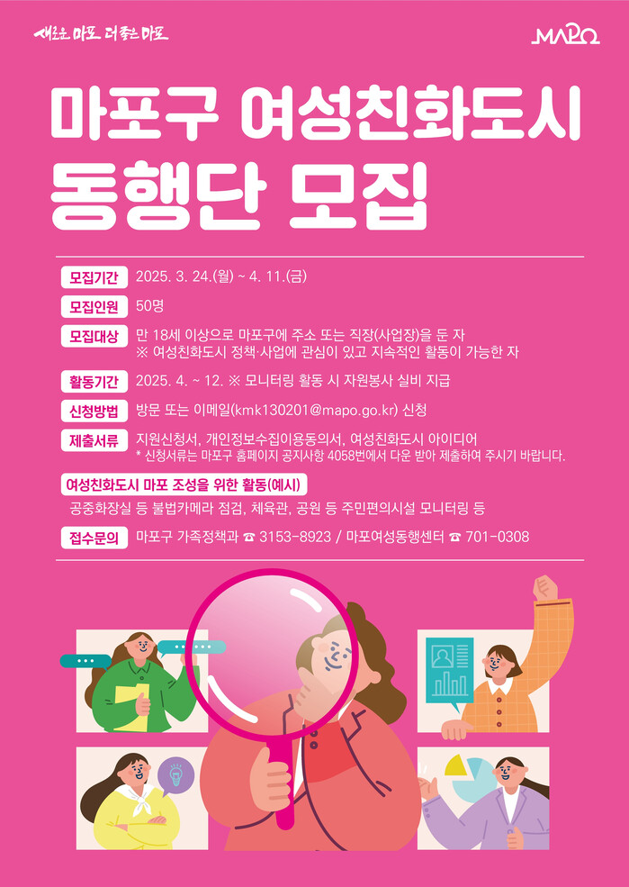 [시민일보 = 문민호 기자] 마포구(구청장 박강수)는 오는 11일까지 ‘마포구 여성친화도시 동행단’으로 활동할 단원을 모집한다.