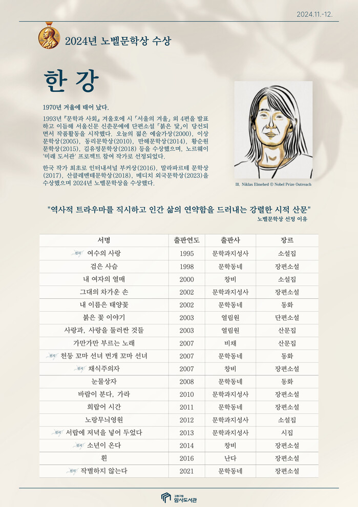 | ▲ <2024년 노벨문학상 수상> 한강 작가 특별 전시 이미지. |