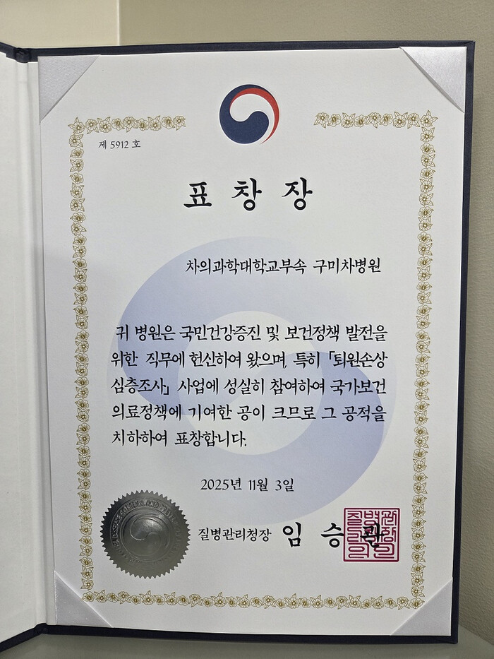 [구미=박병상 기자] 차의과학대학교 부속 구미차병원(병원장 김재오)은 2025년 퇴원손상심층조사 사업에서 국가보건의료정책에 기여한 공로를 인정받아 질병관리청장 표창을 수상했다고 20일 밝혔다.