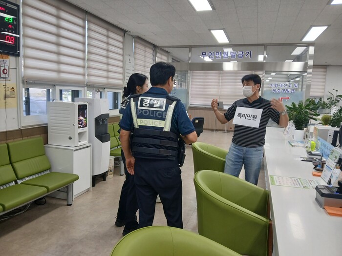 이날 훈련에서는 민원응대 매뉴얼에 따라 민원인 폭언 및 폭행 발생 시 △상급자의 적극적인 개입 △사전고지 후 녹음 △112상황실 비상벨 호출 △피해공무원 보호 △출동 경찰의 민원인 제지 및 인계 등으로 이뤄졌다.