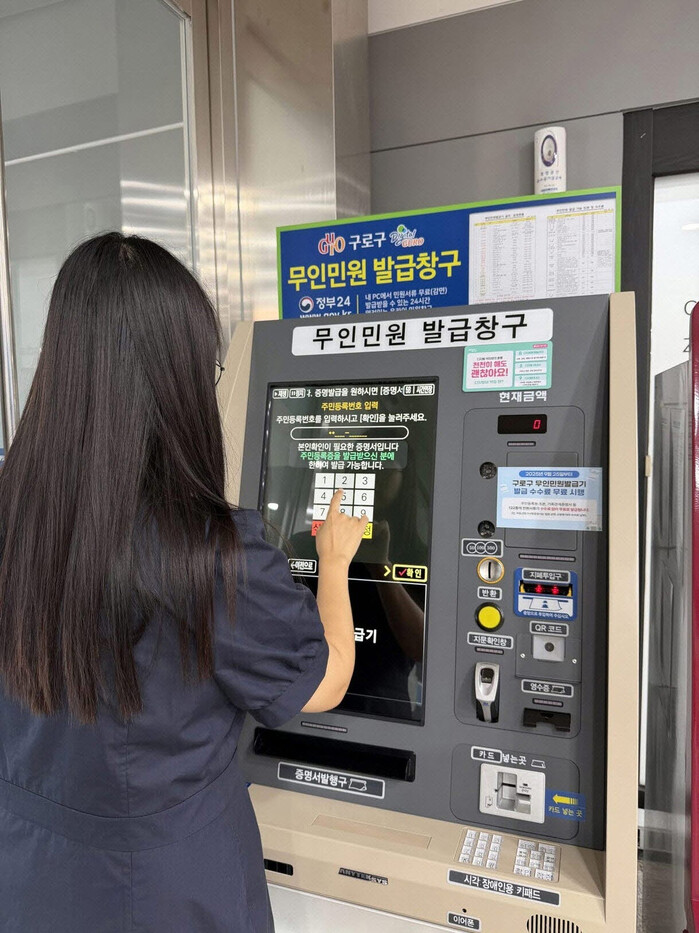 [시민일보 = 박소진 기자] 구로구(구청장 장인홍)가 25일부터 관내 무인민원발급기의 수수료를 전면 면제한다고 밝혔다.