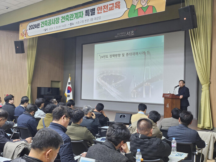 [시민일보 = 박소진 기자] 서초구(구청장 전성수)는 안전한 건설공사 환경을 조성하기 위해 오는 18일 오전 9시30분, 서초문화예술회관 대강당에서 지역내 건축공사장 관계자를 대상으로 특별안전교육을 실시한다고 밝혔다.