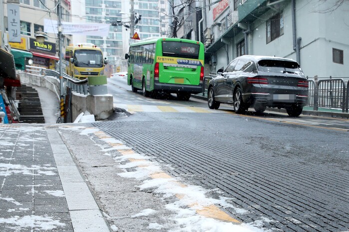 | ▲ 성동구는 이번 겨울 총 51개의 도로열선을 운영한다. 사진은 올해 1월 도로열선이 설치(독서당로 62길 4) 되어 도로에 눈이 쌓이지 않고 녹고 있는 모습. (사진=성동구청 제공) |