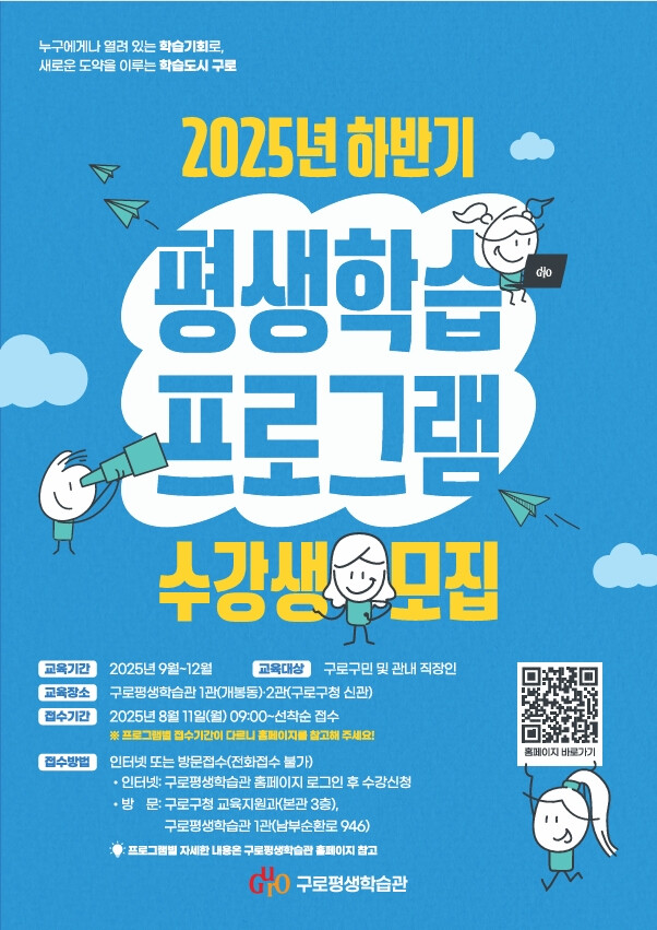 [시민일보 = 박소진 기자] 구로구(구청장 장인홍)는 이달 11일부터 2025년 하반기 구로평생학습관 수강생을 모집한다.