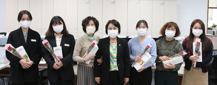| ▲ 이연희 의장(가운데)이 최근 세계 여성의 날을 맞아 의회사무국 여성 직원들에게 장미꽃 한 송이와 케이크를 직접 전달한 후 기념촬영을 하고 있다. (사진제공=서산시의회) |