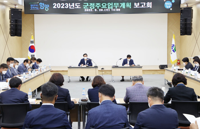 이번 보고회는 민선 8기의 군정지표인 ‘힘찬도약! 함께여는 함양’ 실현을 위한 신규사업을 발굴하고 내년도에 중점적으로 추진할 시책을 검토하기 위해 마련된 자리로 부서별 사업계획 보고, 질의응답 순으로 진행됐다.