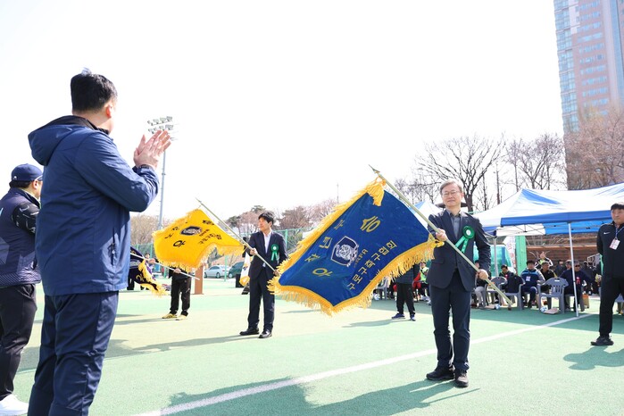 | ▲ 6일 ‘제42회 구로구협회장기 축구대회’에 참석한 장인홍 구로구청장이 우승 깃발을 흔들고 있다. (사진=구로구청 제공) |