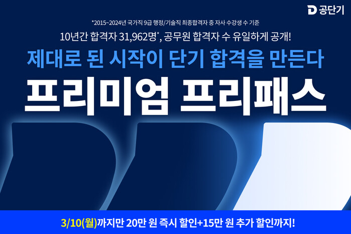 [시민일보 = 여영준 기자] 에스티유니타스의 공무원 시험 전문 브랜드 ‘공단기’는 예비 수험생과 기존 수험생의 단기 합격을 지원하는 ‘26대비 플러스 프리미엄 프리패스’ 상품을 출시했다고 7일 밝혔다.