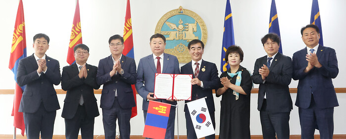 | ▲ 몽골 다르항올도의회 교류 10주년 기념 친선관계 확립을 위한 양해각서(MOU) 갱신 체결식에서 염종현 의장(오른쪽 네 번째)이 양해각서 체결 후 관계자들과 기념촬영을 하고 있다. (사진=경기도의회 제공) |