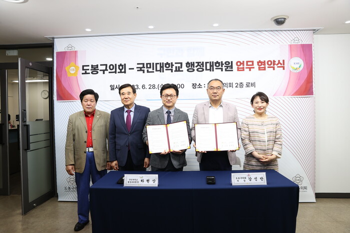 [시민일보 = 여영준 기자] 서울 도봉구의회(의장 강신만)가 최근 구의회에서 국민대학교 행정대학원과 양 기관의 상호 이익 증진과 우호를 위한 관학협력 업무협약 체결식을 했다.