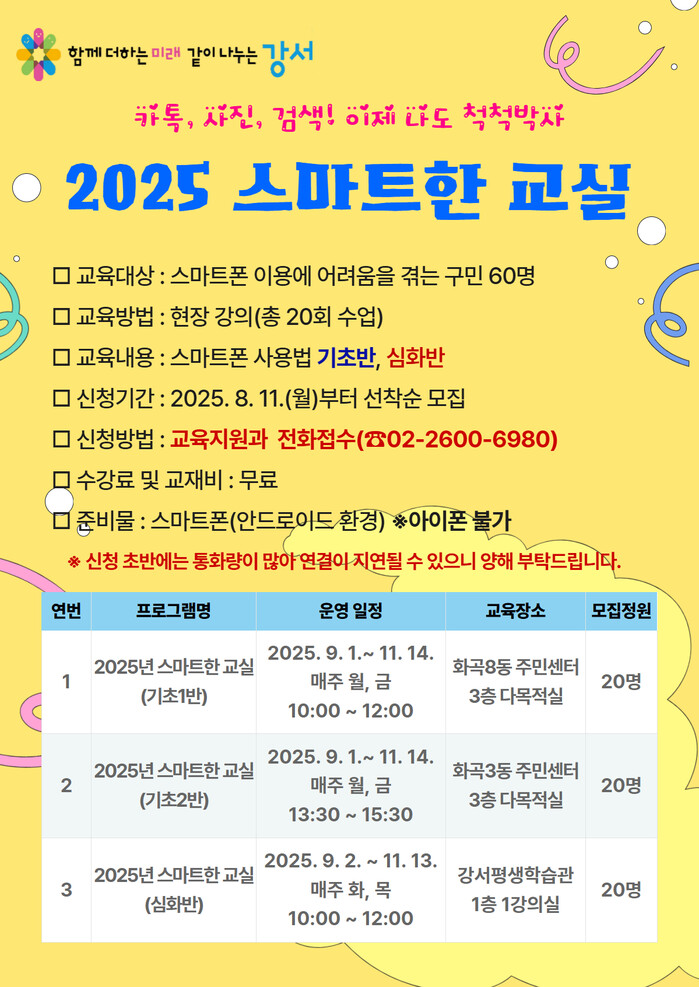 [시민일보 = 박소진 기자] 강서구(구청장 진교훈)는 디지털 소외계층을 위한 맞춤형 교육 프로그램 ‘2025년 스마트한 교실’을 운영한다고 밝혔다.