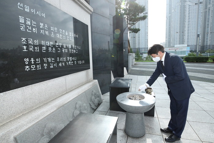 이동환 고양특례시장이 첫 출근일인 7월 1일 덕이동 현충공원을 찾아 호국영령에게 분향하고 있다.(사진제공=고양시청)