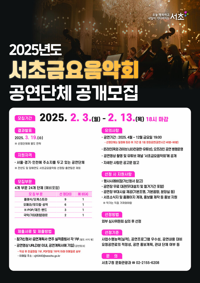 [시민일보 = 박소진 기자] 서초구(구청장 전성수)는 2025년 서초금요음악회에 출연할 공연단체를 오는 13일까지 모집한다고 7일 밝혔다.