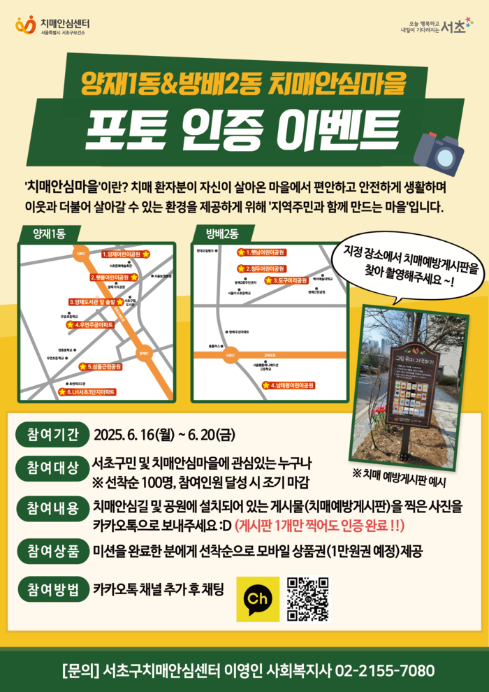 [시민일보 = 박소진 기자] 서초구(구청장 전성수)는 치매친화적인 환경을 조성하기 위해 오는 27일까지 내곡동, 양재1동 등 치매안심마을에서 ‘치매안심길 포토인증 이벤트’를 개최한다고 밝혔다.