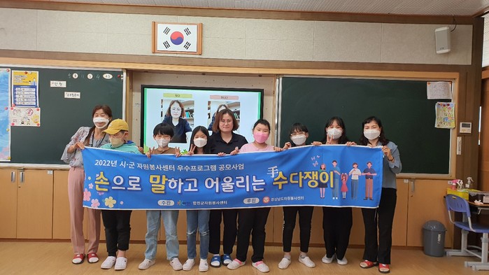 합천군자원봉사센터는 지난 11일부터 남정초등학교에서 학생 9명을 대상으로 경상남도자원봉사센터 우수프로그램 공모사업(청소년 대상 프로그램)으로 선정된「손으로 말하고 어울리는 수(手)다쟁이」사업의 방과후 수어교실을 진행한다고 밝혔다.