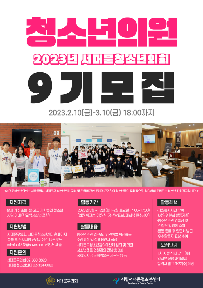 [시민일보 = 홍덕표 기자] 서울 서대문구의회(의장 이동화)가 올 한 해 서대문 청소년의회 활동을 함께 할 '9기 청소년의원'을 오는 3월10일까지 모집한다.