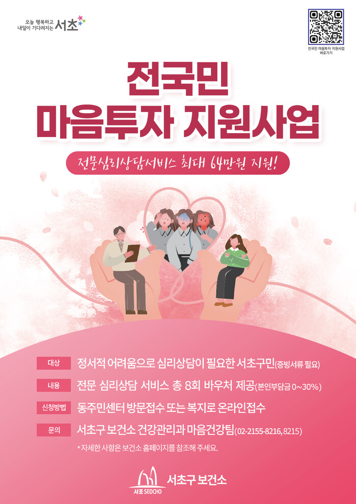 [시민일보 = 박소진 기자] 서초구(구청장 전성수)가 구민의 마음 건강을 돌보고 심리적 어려움을 해소하기 위해 2025년 ‘전국민 마음투자 지원사업’ 추진에 적극 나선다고 10일 밝혔다.