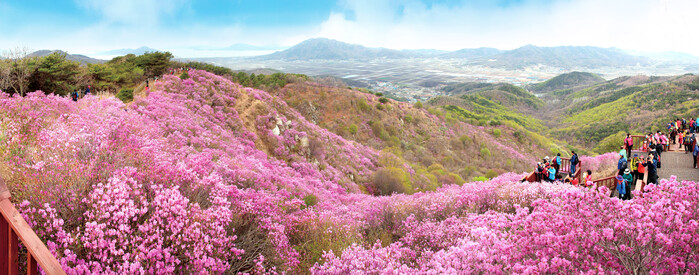 | ▲ 강화도 고려산 진달래 축제 참가자들이 분홍빛 진달래로 물든 풍경을 감상하고 있다. (사진=인천관광공사 제공) |