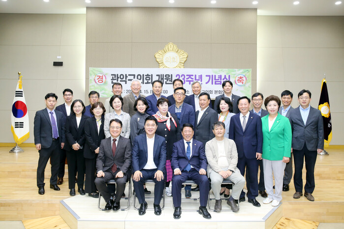 서울 관악구의회가 15일 구의회 4층 본회의장에서 ‘관악구의회 제33주년 개원기념식’을 했다. 기념식에는 임춘수 의장을 비롯한 박준희 관악구청장, 집행부 공무원, 의회사무국 직원, 주민 등 60여명이 참석했다. 사진은 개원기념식에 참석한 의원 및 참여자들이 기념촬영을 하고 있는 모습. (사진=관악구의회 제공)