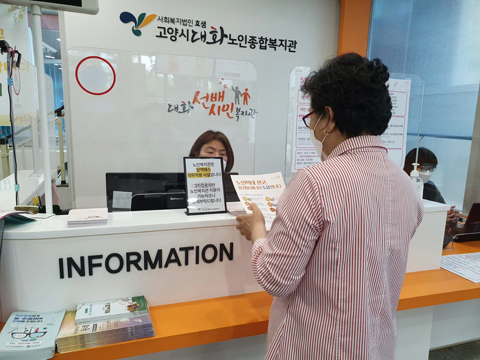| ▲ 노인상담매니저가 복지관을 찾은 어르신에게 복지관안내와 프로그램 이용법을 비롯해 간단한 노인상담을 하고 있다.(사진제공=고양시청) |