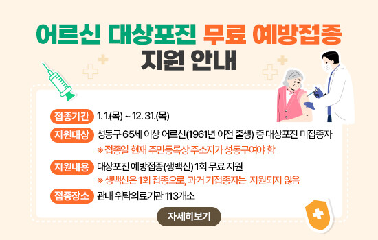 접종 대상은 1961년 12월 31일 이전 출생자로, 성동구에 주민등록을 둔 구민이다.