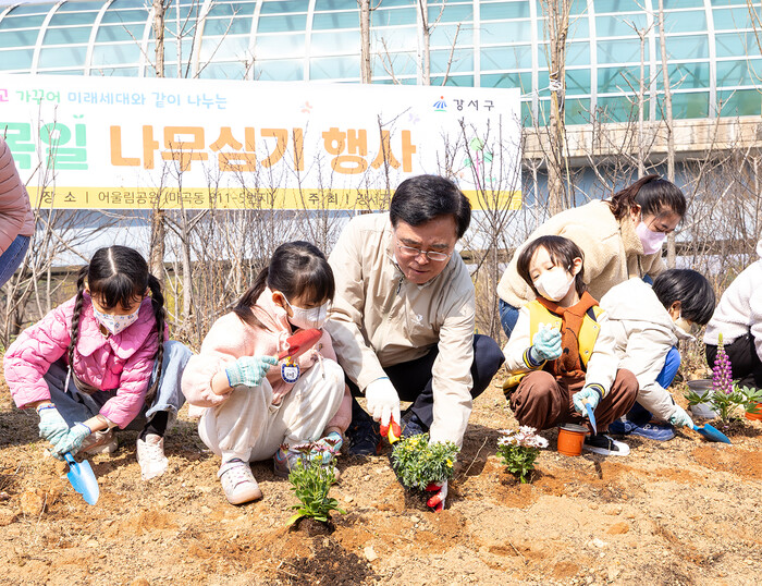 | ▲ 진교훈 서울 강서구청장(왼쪽 세 번째)이 지난 4일(금) 오전 마곡 어울림공원에서 열린 ‘제80회 식목일 기념행사’에서 아이들과 함께 꽃을 심고 있다. (사진=강서구청 제공) |