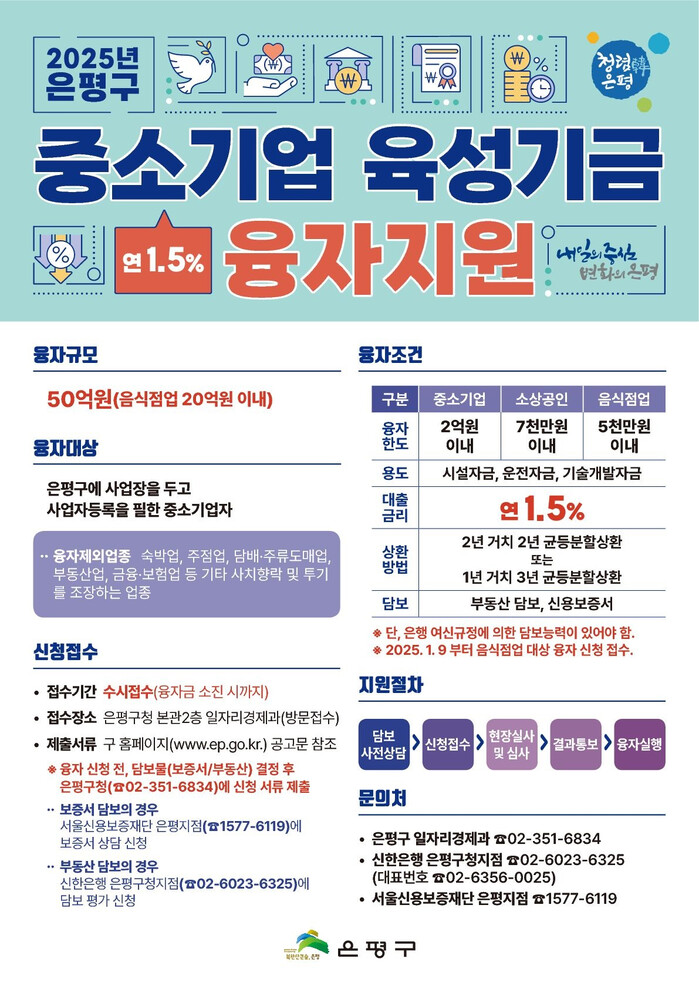 [시민일보 = 이대우 기자] 은평구(구청장 김미경)는 내수 침체 장기화와 정치적 혼란이 가져온 소비 위축으로, 관내 중소기업과 소상공인의 경영 안정을 돕기 위해 ‘2025년 중소기업 육성기금 융자지원’을 시행한다고 밝혔다.