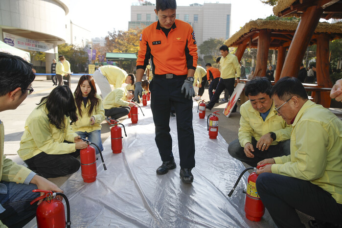 또한, 화재 진압 완료 후에는 대피 훈련에 참여한 인원을 대상으로 화재 시 행동요령 및 소화기 사용법에 대한 교육을 실시했으며, 소화기 사용을 직접 체험해 보는 시간도 가졌다.