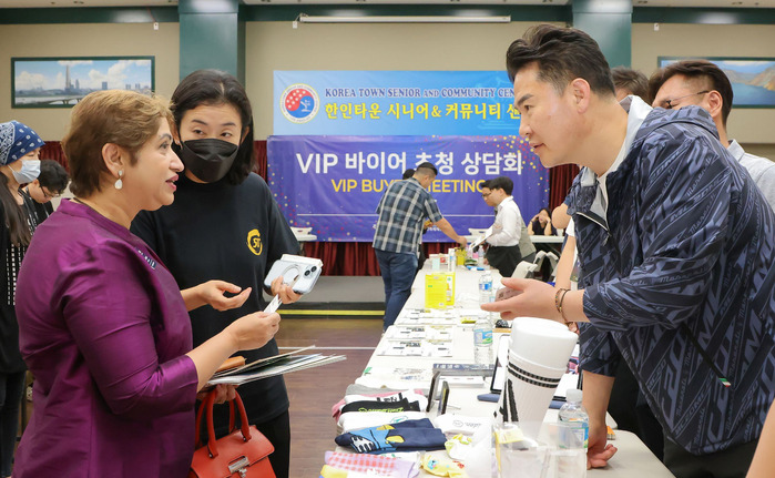 | ▲ 오언석 구청장(오른쪽)이 LA 한인축제 바이어 초청 상담회에서 도봉구 제품을 홍보하고 있다. (사진=도봉구청 제공) |