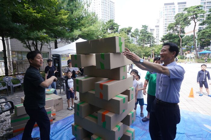 | ▲ 행사장에 방문한 이승로 성북구청장(오른쪽)과 김영배 국회의원(왼쪽)이 아이들과 함께 대형 젠가 놀이에 참여했다. (사진=성북구청 제공) |