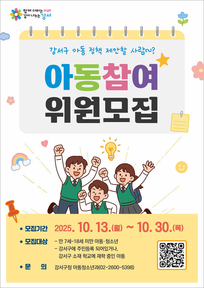 참여를 희망하는 아동은 오는 30일까지 강서구청 아동청소년과(양천로 61길 101, 가양도서관 2층)에 방문하거나, 우편 또는 전자우편(jeong777@gangseo.seoul.kr)으로 신청하면 된다.