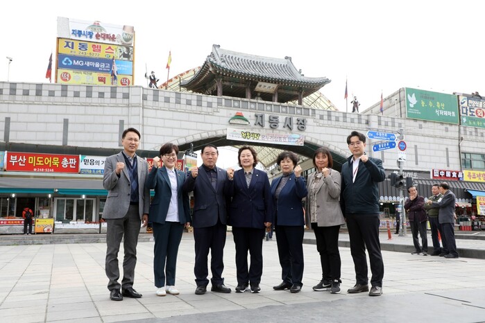 | ▲ 지동시장을 찾은 수원시의원들이 기념촬영을 하고 있다. (사진=수원시의회 제공) |