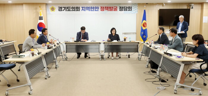 | ▲ 경기도 건설국, 철도항만물류국, 출산동물복지국과의 지역현안 정책발굴 정담회 진행 모습. (사진=경기도의회 제공) |