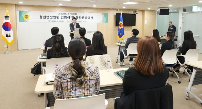 | ▲ 최근 열린 2023년 상반기 청년행정인턴 임명식 및 오리엔테이션에서 김종석 사무처장이 최종 선발된 청년들에게 임명장을 수여하고 지방자치의 의미와 도의회에 대한 강연을 하고 있다. (사진=경기도의회 제공) |