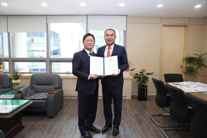 | ▲ 강신만 의장(오른쪽)과 김민재 법률고문(왼쪽)이 위촉장을 들고 기념촬영을 하고 있다. (사진제공=도봉구의회) |