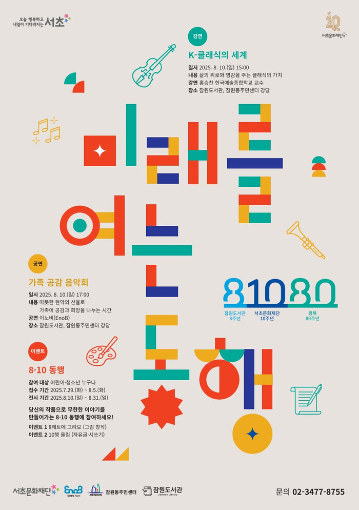 ‘미래를 여는 동행’은 잠원도서관의 개관 8주년, 서초문화재단 설립 10주년, 광복 80주년을 기념하여 잠원동 주민센터 강당에서 진행되는 프로그램으로 강연, 가족 공감 음악회, 8·10 동행 시상식 등 다채로운 행사를 진행한다.