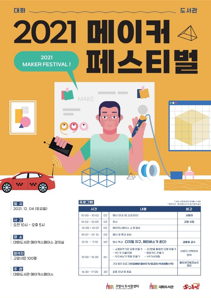 [고양=이기홍 기자] 고양시 도서관센터가 ‘가족과 함께하는 메이커 체험’을 주제로 오는 12월 4일 대화도서관에서 ‘2021 대화도서관 메이커 페스티벌’을 개최한다.